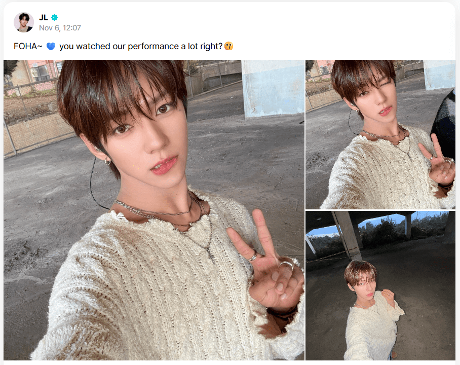 Categories JL UPDATES November 6 2025 – JL Updates Post author By AHOF JAEYEL Post date November 8, 2025 November 06, 2025 FOHA~ ๐ you watched our performance a lot right?๐ see post here PREV NEXT Share this: Share on X (Opens in new window) X Share on Facebook (Opens in new window) Facebook ← Korea FSE – Pinocchio Era 11/7/25 – Fansites → November 7 2025 – JL Updates & Schedule